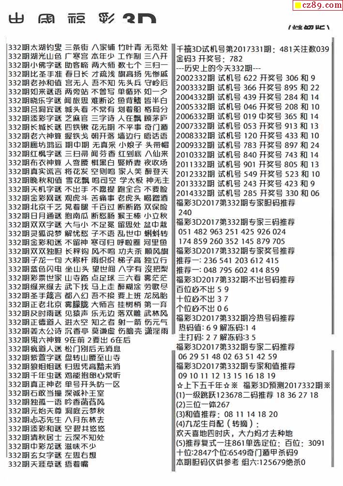 杀手+鑫马快报+字迷汇总25年332期3d图谜